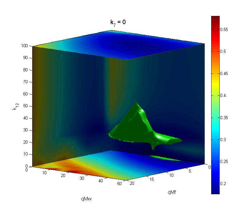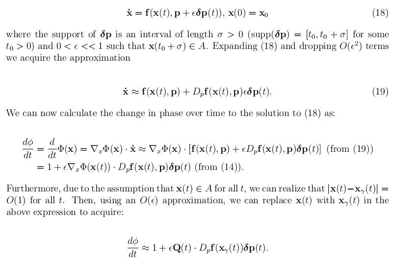 The first image sequence displays results from a circadian experiment I designed and conducted on the fungus, Neurospora, using the image processing software ImageJ. Bioluminescence shows that the top two fungus samples are out of phase with the bottom two samples. The second figure is a sample of perturbation work I have done in relation to phase response curves. Assuming a small pulse is applied to a limit cycle oscillator, it is reasonable to use perturbation theory to approximate the PRC using the infinitesimal Phase Response Curve (iPRC). The iPRC is numerically tractable, and can be extremely useful when studying the shape of the PRC. The third image sequence is an animation created with MATLAB that tracks the error of a phase response curve (against experimental data) when varying four parameters involved in the definition of the pulse. The four parameters are represented by space and time, and an isosurface (7% above the minimum error) is plotted in green for each set of parameters.