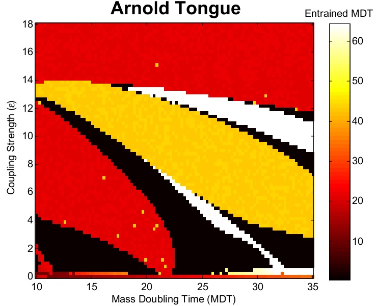The first image in the bottom row displays an Arnold Tongue of a model which simulates a circadian clock entraining a cell division cycle (master-slave oscillator). The division cycle will have a different entrained MDT depending on the uncoupled period of the division cycle (Mass Doubling Time, or MDT) and the strength of the coupling. The region of values causing the division cycle to entrain to the circadian period is known as an Arnold Tongue. My MATLAB code for calculating the Arnold Tongue can be found here. The second image is a two-parameter bifurcation diagram of a circadian clock model. For various combinations of the two parameters shown, the limit cycle of the model can experience various period lengths (values in red). The region of oscillation is separated by a boundary of Hopf bifurcation points which cause the limit cycle to disappear when crossed. The final image sequence in the bottom row is the result of a sample fluid flow problem I have completed using the COMSOL Mutiphysics software platform. The animation shows a red ink droplet (red) being propelled down an inkjet nozzle onto paper. The original problem can be found here.